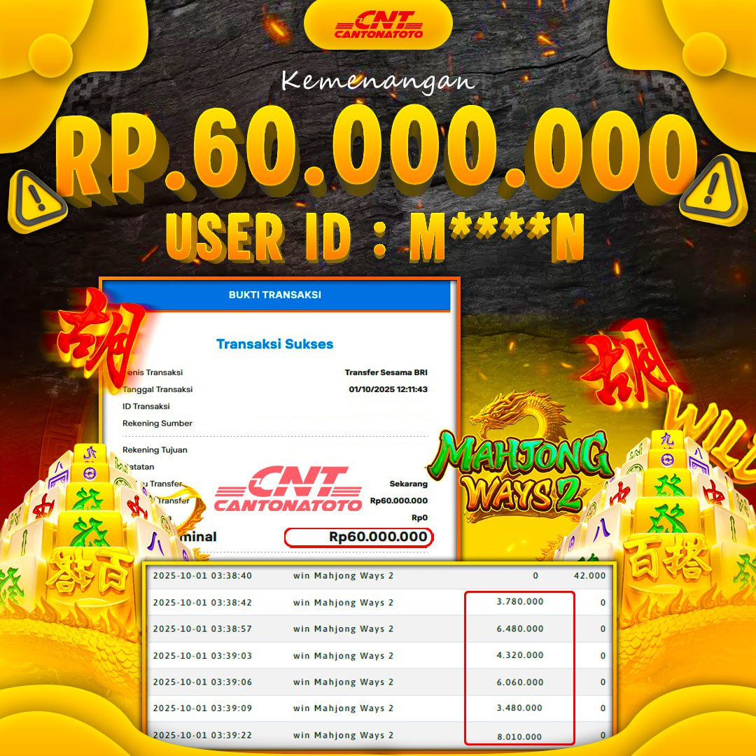 ❤️SEL4M4T KEPADA M3MB3R S3TIA CANTONATOTO ????TANGGAL : 1 OKTOBER 2025 ????USER ID : M****N ????B0 : CNTT ????M3N4NG : Mahjong Ways 2 ????RP. 60.000.000