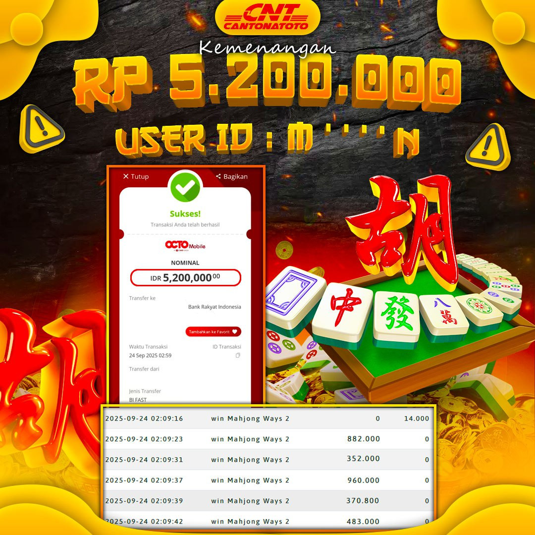 ❤️SEL4M4T KEPADA M3MB3R S3TIA CANTONATOTO ????TANGGAL : 24 SEPTEMBER 2025 ????USER ID : M****N ????B0 : CNTT ????M3N4NG : Mahjong Ways ????RP. 5.200.000