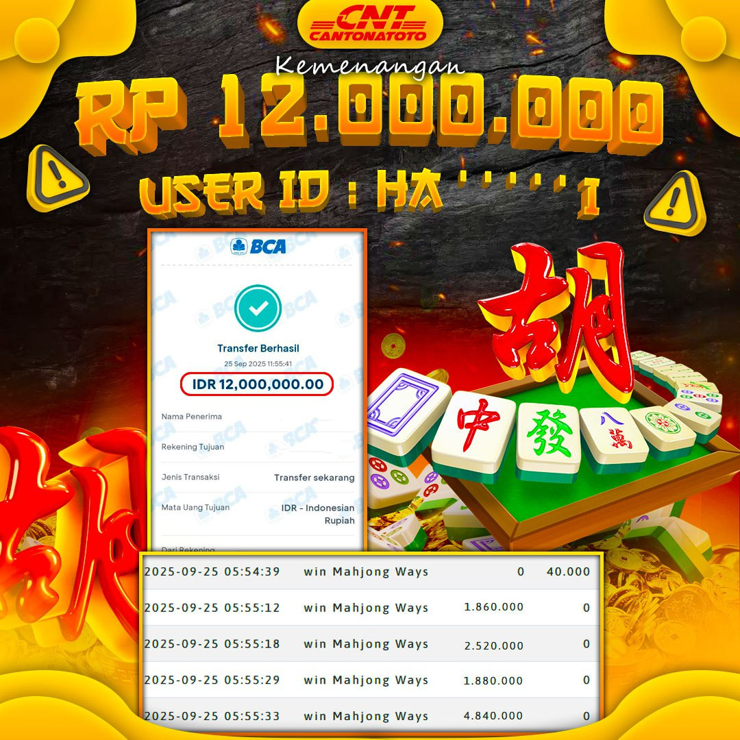 ❤️SEL4M4T KEPADA M3MB3R S3TIA CANTONATOTO ????TANGGAL : 25 SEPTEMBER 2025 ????USER ID : H*****KI ????B0 : CNTT ????M3N4NG : Mahjong Ways ????RP. 12.000.000